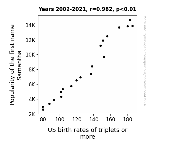 This means 96.5% of the change in the one variable (i.e., US birth rates of triplets or more) is predictable based on the change in the other (i.e., Popularity of the first name Samantha) over the 20 years from 2002 through 2021.