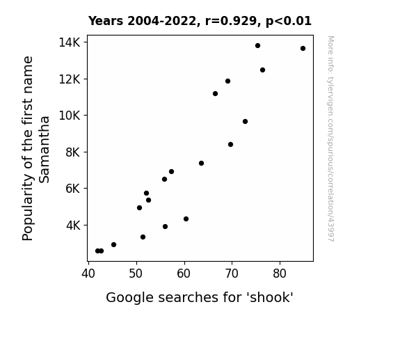 This means 86.3% of the change in the one variable (i.e., Google searches for 'shook') is predictable based on the change in the other (i.e., Popularity of the first name Samantha) over the 19 years from 2004 through 2022.