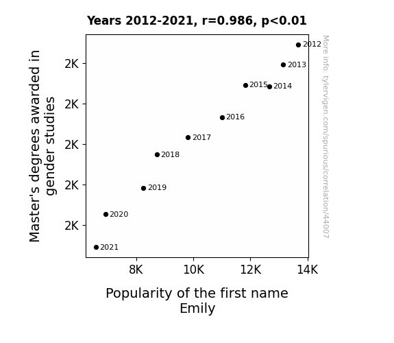This means 97.2% of the change in the one variable (i.e., Popularity of the first name Emily) is predictable based on the change in the other (i.e., Master's degrees awarded in gender studies) over the 10 years from 2012 through 2021.