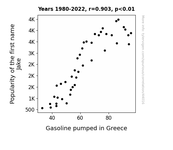 This means 81.5% of the change in the one variable (i.e., Gasoline pumped in Greece) is predictable based on the change in the other (i.e., Popularity of the first name Jake) over the 43 years from 1980 through 2022.