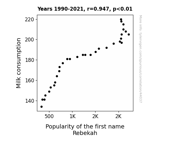 This means 89.7% of the change in the one variable (i.e., Popularity of the first name Rebekah) is predictable based on the change in the other (i.e., Milk consumption) over the 32 years from 1990 through 2021.