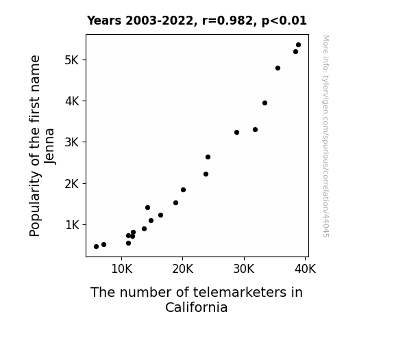 This means 96.4% of the change in the one variable (i.e., The number of telemarketers in California) is predictable based on the change in the other (i.e., Popularity of the first name Jenna) over the 20 years from 2003 through 2022.