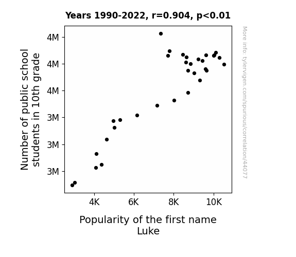 This means 81.7% of the change in the one variable (i.e., Popularity of the first name Luke) is predictable based on the change in the other (i.e., Number of public school students in 10th grade) over the 33 years from 1990 through 2022.