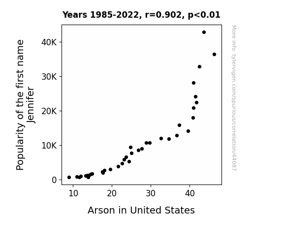 This means 81.4% of the change in the one variable (i.e., Arson in United States) is predictable based on the change in the other (i.e., Popularity of the first name Jennifer) over the 38 years from 1985 through 2022.