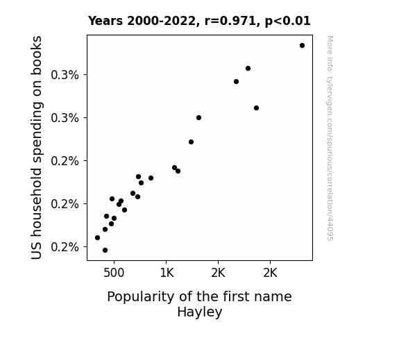 This means 94.3% of the change in the one variable (i.e., Popularity of the first name Hayley) is predictable based on the change in the other (i.e., US household spending on books) over the 23 years from 2000 through 2022.