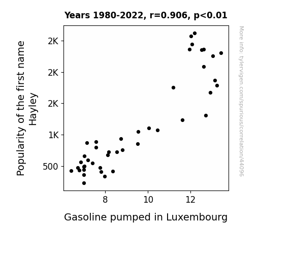 This means 82% of the change in the one variable (i.e., Gasoline pumped in Luxembourg) is predictable based on the change in the other (i.e., Popularity of the first name Hayley) over the 43 years from 1980 through 2022.