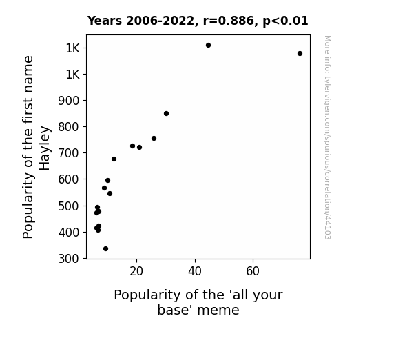 This means 78.5% of the change in the one variable (i.e., Popularity of the 'all your base' meme) is predictable based on the change in the other (i.e., Popularity of the first name Hayley) over the 17 years from 2006 through 2022.