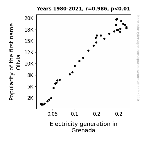 This means 97.2% of the change in the one variable (i.e., Electricity generation in Grenada) is predictable based on the change in the other (i.e., Popularity of the first name Olivia) over the 42 years from 1980 through 2021.