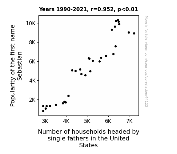 This means 90.6% of the change in the one variable (i.e., Number of households headed by single fathers in the United States) is predictable based on the change in the other (i.e., Popularity of the first name Sebastian) over the 32 years from 1990 through 2021.