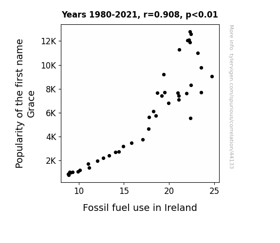 This means 82.4% of the change in the one variable (i.e., Fossil fuel use in Ireland) is predictable based on the change in the other (i.e., Popularity of the first name Grace) over the 42 years from 1980 through 2021.