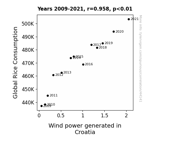 This means 91.8% of the change in the one variable (i.e., Wind power generated in Croatia) is predictable based on the change in the other (i.e., Global Rice Consumption) over the 13 years from 2009 through 2021.