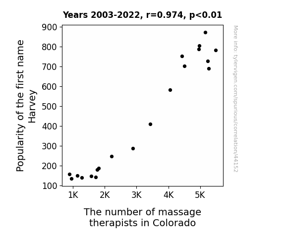 This means 94.8% of the change in the one variable (i.e., The number of massage therapists in Colorado) is predictable based on the change in the other (i.e., Popularity of the first name Harvey) over the 20 years from 2003 through 2022.