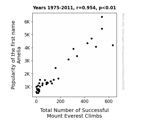 This means 91% of the change in the one variable (i.e., Total Number of Successful Mount Everest Climbs) is predictable based on the change in the other (i.e., Popularity of the first name Amelia) over the 37 years from 1975 through 2011.
