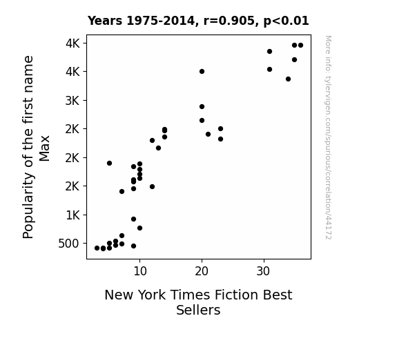 This means 81.9% of the change in the one variable (i.e., New York Times Fiction Best Sellers) is predictable based on the change in the other (i.e., Popularity of the first name Max) over the 40 years from 1975 through 2014.