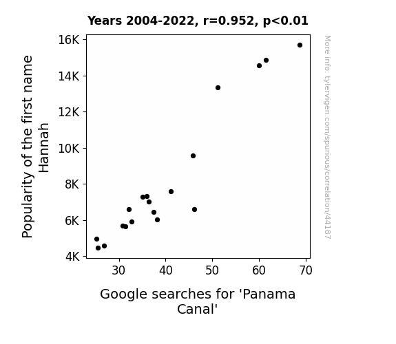 This means 90.6% of the change in the one variable (i.e., Google searches for 'Panama Canal') is predictable based on the change in the other (i.e., Popularity of the first name Hannah) over the 19 years from 2004 through 2022.