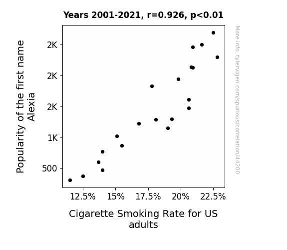 This means 85.7% of the change in the one variable (i.e., Cigarette Smoking Rate for US adults) is predictable based on the change in the other (i.e., Popularity of the first name Alexia) over the 21 years from 2001 through 2021.