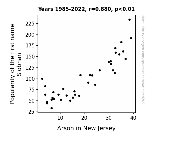 This means 77.5% of the change in the one variable (i.e., Arson in New Jersey) is predictable based on the change in the other (i.e., Popularity of the first name Siobhan) over the 38 years from 1985 through 2022.