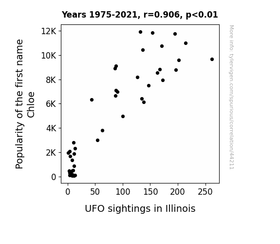 This means 82.1% of the change in the one variable (i.e., UFO sightings in Illinois) is predictable based on the change in the other (i.e., Popularity of the first name Chloe) over the 47 years from 1975 through 2021.