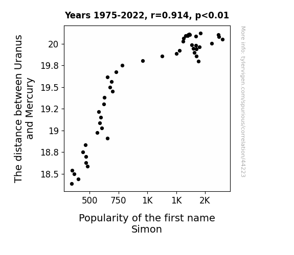 This means 83.6% of the change in the one variable (i.e., Popularity of the first name Simon) is predictable based on the change in the other (i.e., The distance between Uranus and Mercury) over the 48 years from 1975 through 2022.