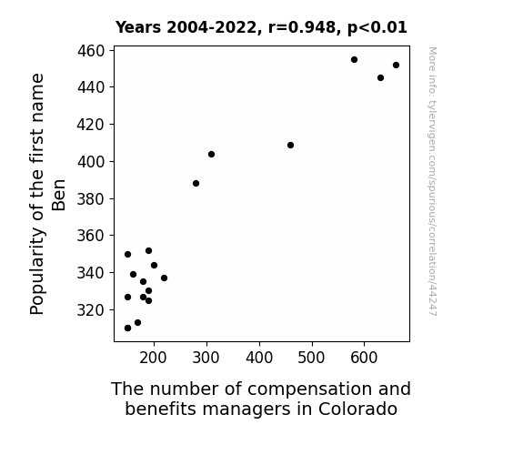 This means 89.8% of the change in the one variable (i.e., The number of compensation and benefits managers in Colorado) is predictable based on the change in the other (i.e., Popularity of the first name Ben) over the 19 years from 2004 through 2022.