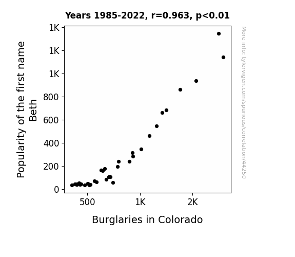 This means 92.8% of the change in the one variable (i.e., Burglaries in Colorado) is predictable based on the change in the other (i.e., Popularity of the first name Beth) over the 38 years from 1985 through 2022.