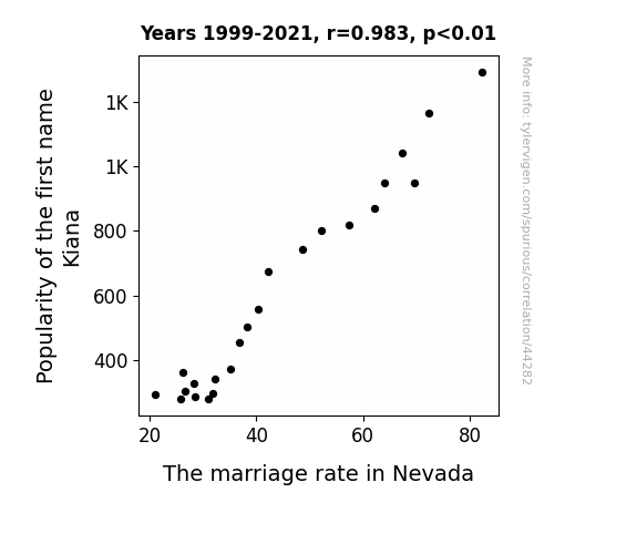 This means 96.5% of the change in the one variable (i.e., The marriage rate in Nevada) is predictable based on the change in the other (i.e., Popularity of the first name Kiana) over the 23 years from 1999 through 2021.