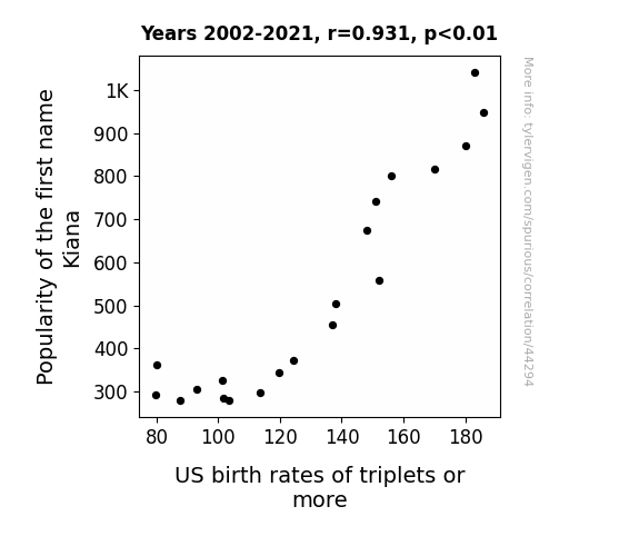 This means 86.7% of the change in the one variable (i.e., US birth rates of triplets or more) is predictable based on the change in the other (i.e., Popularity of the first name Kiana) over the 20 years from 2002 through 2021.