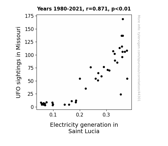 This means 75.9% of the change in the one variable (i.e., Electricity generation in Saint Lucia) is predictable based on the change in the other (i.e., UFO sightings in Missouri) over the 42 years from 1980 through 2021.