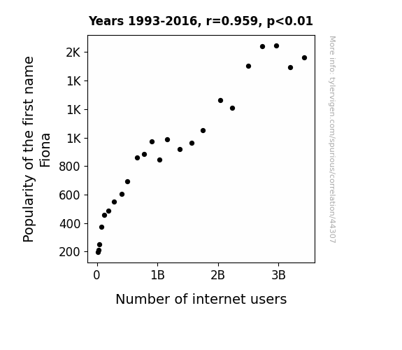 This means 92% of the change in the one variable (i.e., Number of internet users) is predictable based on the change in the other (i.e., Popularity of the first name Fiona) over the 24 years from 1993 through 2016.