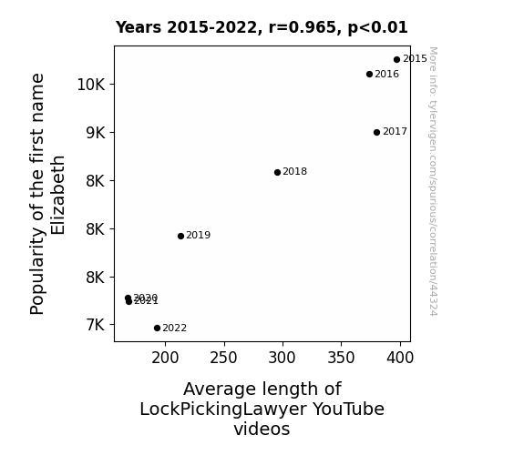 This means 93.1% of the change in the one variable (i.e., Average length of LockPickingLawyer YouTube videos) is predictable based on the change in the other (i.e., Popularity of the first name Elizabeth) over the 8 years from 2015 through 2022.