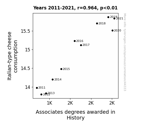 This means 93% of the change in the one variable (i.e., Associates degrees awarded in History) is predictable based on the change in the other (i.e., Italian-type cheese consumption) over the 11 years from 2011 through 2021.