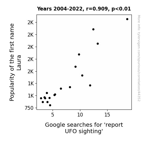 This means 82.7% of the change in the one variable (i.e., Google searches for 'report UFO sighting') is predictable based on the change in the other (i.e., Popularity of the first name Laura) over the 19 years from 2004 through 2022.