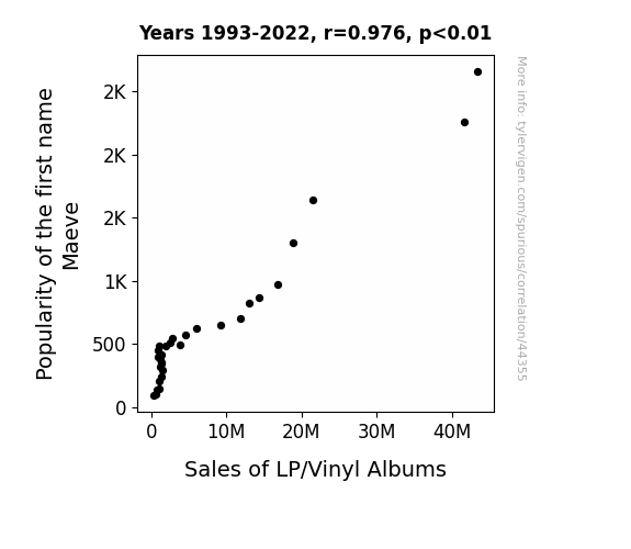 This means 95.3% of the change in the one variable (i.e., Sales of LP/Vinyl Albums) is predictable based on the change in the other (i.e., Popularity of the first name Maeve) over the 30 years from 1993 through 2022.
