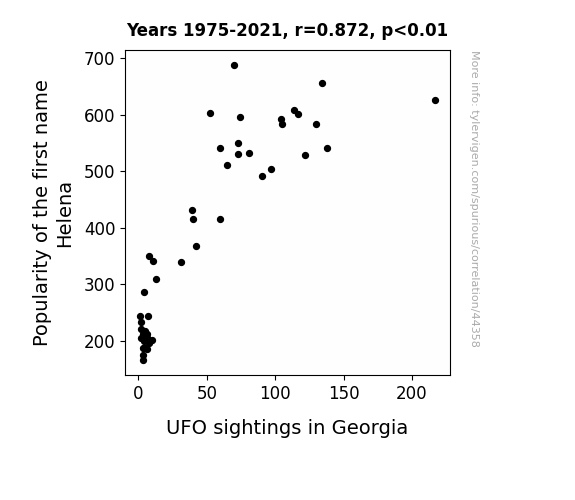 This means 76% of the change in the one variable (i.e., UFO sightings in Georgia) is predictable based on the change in the other (i.e., Popularity of the first name Helena) over the 47 years from 1975 through 2021.