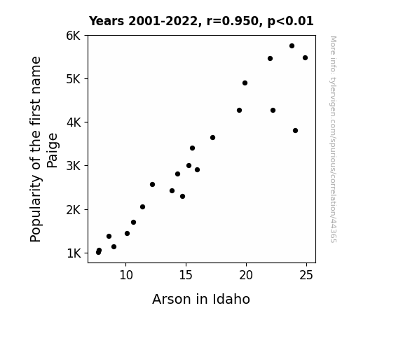 This means 90.3% of the change in the one variable (i.e., Arson in Idaho) is predictable based on the change in the other (i.e., Popularity of the first name Paige) over the 22 years from 2001 through 2022.