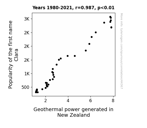 This means 97.4% of the change in the one variable (i.e., Geothermal power generated in New Zealand) is predictable based on the change in the other (i.e., Popularity of the first name Clara) over the 42 years from 1980 through 2021.