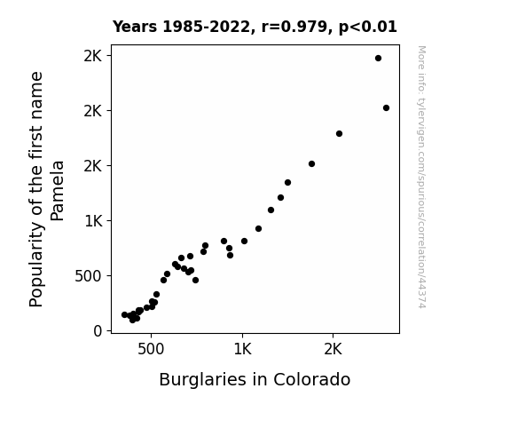 This means 95.8% of the change in the one variable (i.e., Burglaries in Colorado) is predictable based on the change in the other (i.e., Popularity of the first name Pamela) over the 38 years from 1985 through 2022.