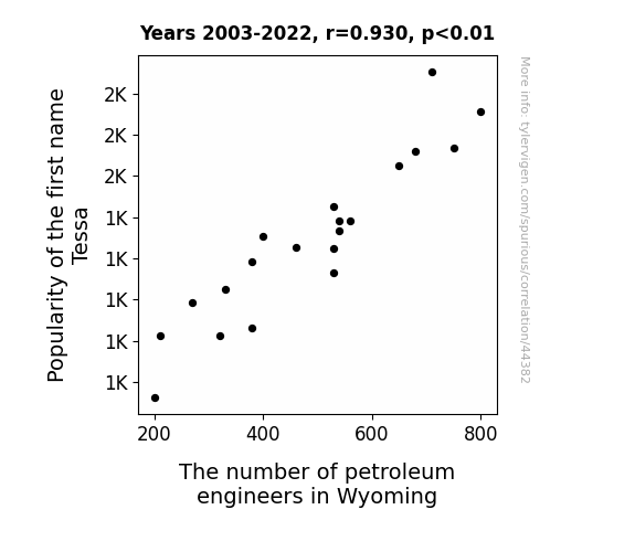 This means 86.4% of the change in the one variable (i.e., The number of petroleum engineers in Wyoming) is predictable based on the change in the other (i.e., Popularity of the first name Tessa) over the 20 years from 2003 through 2022.