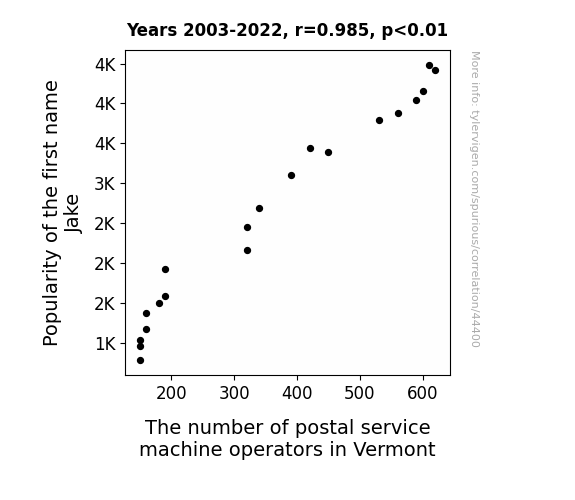 This means 97.1% of the change in the one variable (i.e., The number of postal service machine operators in Vermont) is predictable based on the change in the other (i.e., Popularity of the first name Jake) over the 20 years from 2003 through 2022.