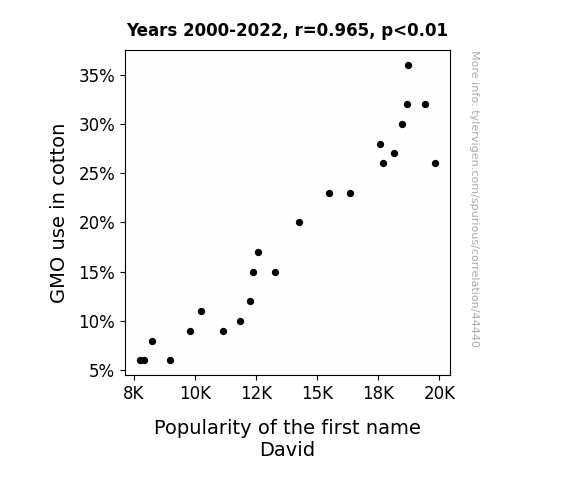 This means 93% of the change in the one variable (i.e., Popularity of the first name David) is predictable based on the change in the other (i.e., GMO use in cotton) over the 23 years from 2000 through 2022.