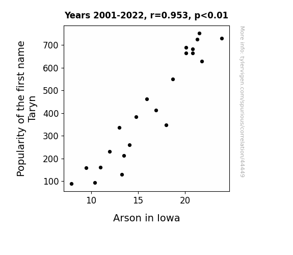 This means 90.9% of the change in the one variable (i.e., Arson in Iowa) is predictable based on the change in the other (i.e., Popularity of the first name Taryn) over the 22 years from 2001 through 2022.