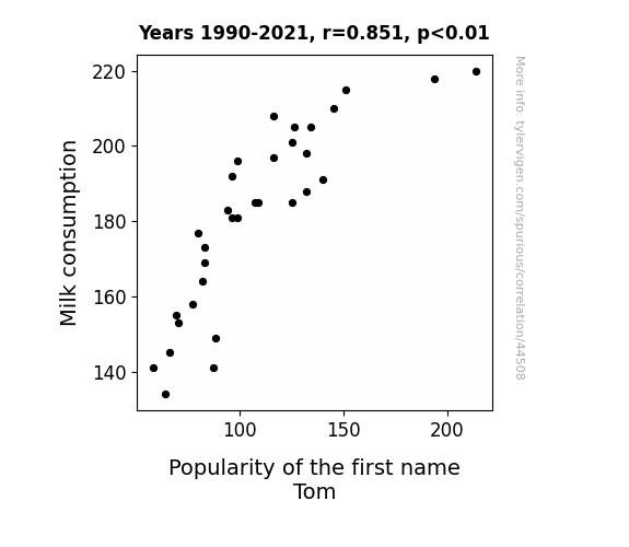 This means 72.5% of the change in the one variable (i.e., Popularity of the first name Tom) is predictable based on the change in the other (i.e., Milk consumption) over the 32 years from 1990 through 2021.
