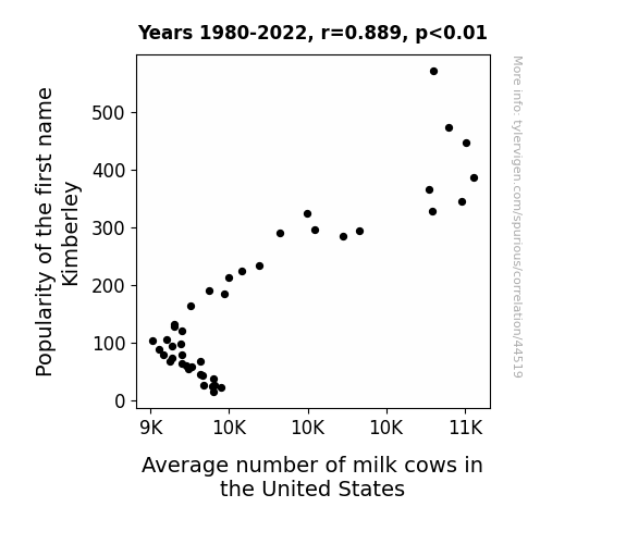 This means 78.9% of the change in the one variable (i.e., Average number of milk cows in the United States) is predictable based on the change in the other (i.e., Popularity of the first name Kimberley) over the 43 years from 1980 through 2022.