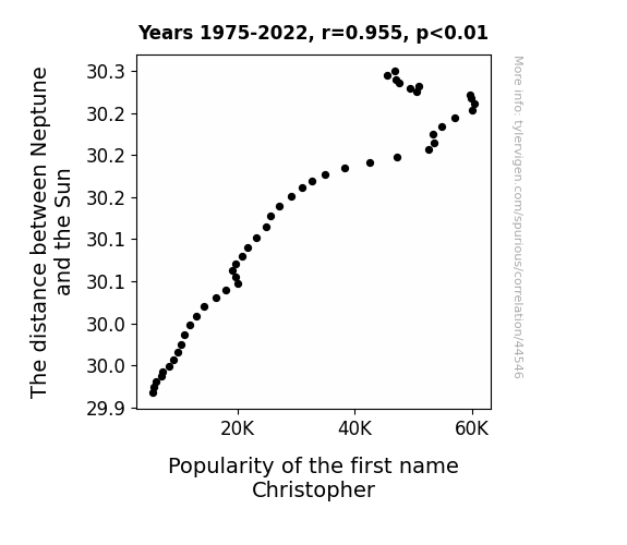This means 91.2% of the change in the one variable (i.e., Popularity of the first name Christopher) is predictable based on the change in the other (i.e., The distance between Neptune and the Sun) over the 48 years from 1975 through 2022.