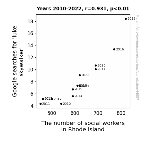 This means 86.7% of the change in the one variable (i.e., The number of social workers in Rhode Island) is predictable based on the change in the other (i.e., Google searches for 'luke skywalker') over the 13 years from 2010 through 2022.