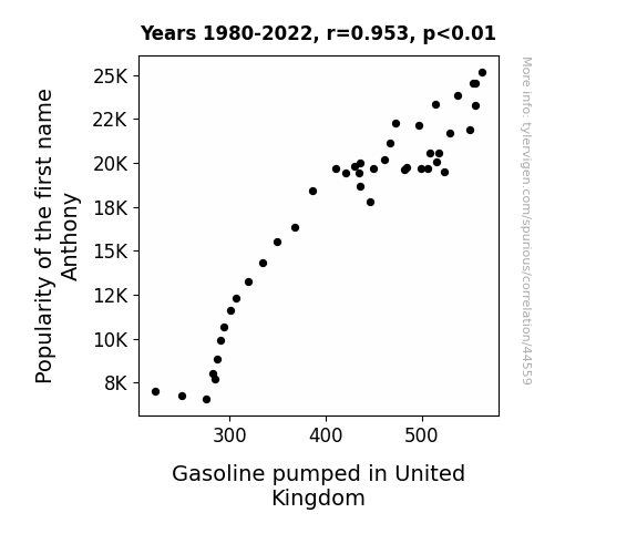 This means 90.7% of the change in the one variable (i.e., Gasoline pumped in United Kingdom) is predictable based on the change in the other (i.e., Popularity of the first name Anthony) over the 43 years from 1980 through 2022.