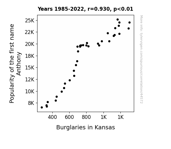 This means 86.5% of the change in the one variable (i.e., Burglaries in Kansas) is predictable based on the change in the other (i.e., Popularity of the first name Anthony) over the 38 years from 1985 through 2022.