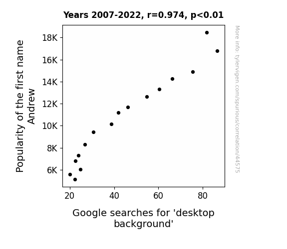 This means 94.9% of the change in the one variable (i.e., Google searches for 'desktop background') is predictable based on the change in the other (i.e., Popularity of the first name Andrew) over the 16 years from 2007 through 2022.