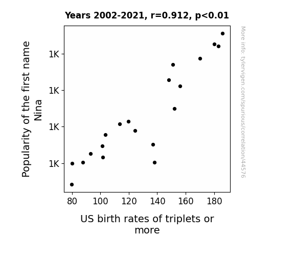 This means 83.1% of the change in the one variable (i.e., US birth rates of triplets or more) is predictable based on the change in the other (i.e., Popularity of the first name Nina) over the 20 years from 2002 through 2021.