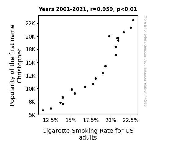 This means 92% of the change in the one variable (i.e., Cigarette Smoking Rate for US adults) is predictable based on the change in the other (i.e., Popularity of the first name Christopher) over the 21 years from 2001 through 2021.